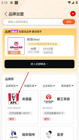 进入首页后,点击“看品牌”选项,即可进入品牌加盟页面。