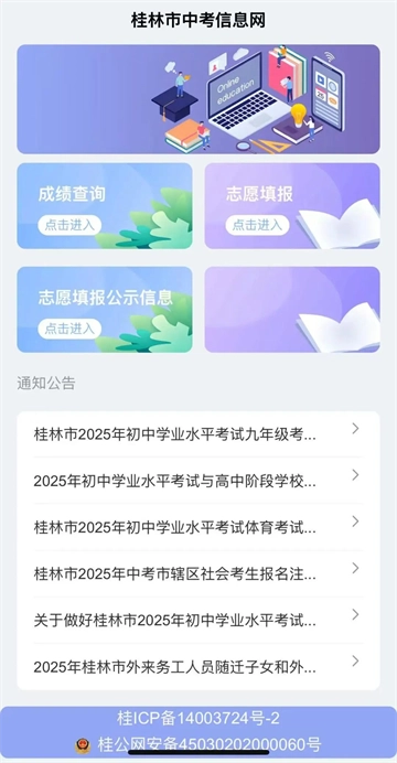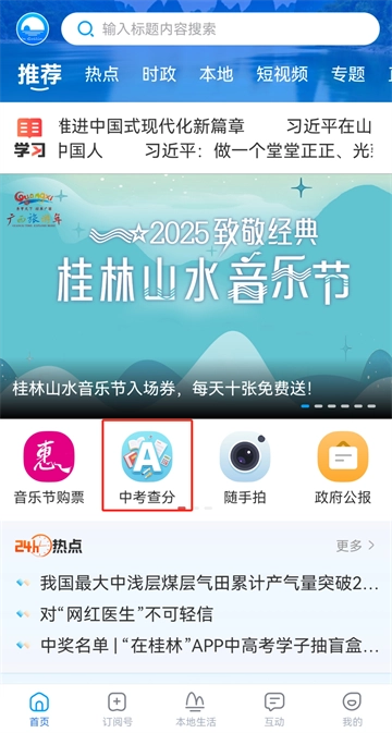 安装并打开“在桂林”应用,进入首页后点击“中考查分”选项。