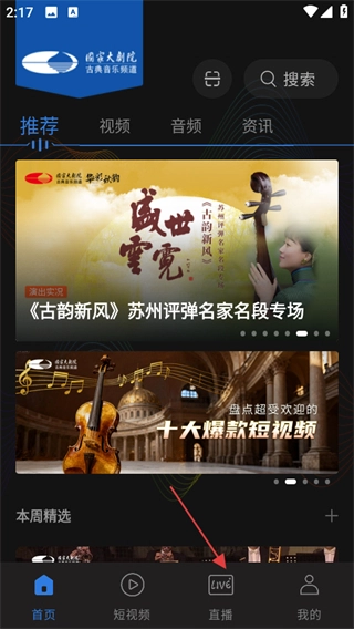 在大剧院古典首页,点击底部的直播选项,进入直播页面。