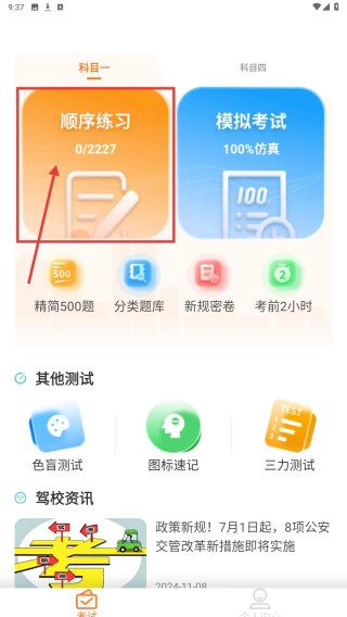 打开驾考学习应用,点击科目一板块的顺序练习选项,进入练习页面。