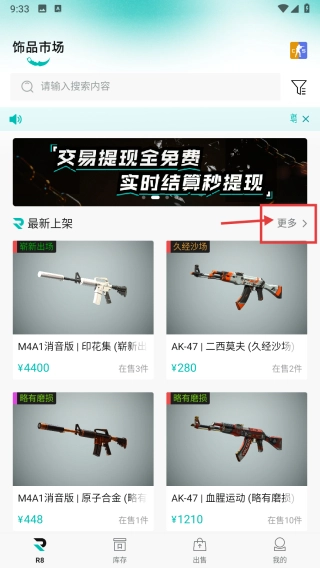 进入饰品交易分类,点击最新上架板块的更多按钮,即可进入饰品市场的列表页面。