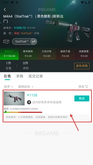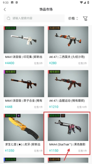 在饰品市场的列表中,找到M4A4-StatTrak™|黑色魅影(崭新出厂)的饰品条目并点击,进入该饰品的详情页面。