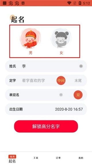 3. 输入出生年月日、姓氏、性别以及名字的单双字要求,即可快速生成名字。