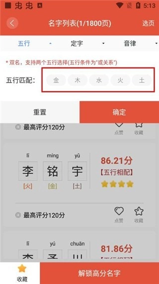 4、选定宝宝的五行属性后,系统会依据金木水火土五行来完成匹配。