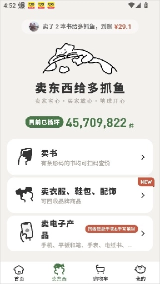 多抓鱼二手书平台主打闲置循环利用,属于生活服务类App。通过这个App,用户既能便捷处理闲置的书籍、衣物和电子产品,又能以实惠价格买到经过鉴定翻新的高品质二手物品。