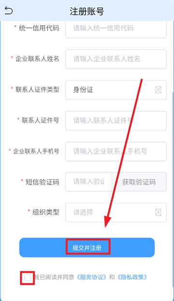 进入注册页面后,填写所需信息,勾选“我已阅读并同意《服务协议》与《隐私政策》”,然后点击提交注册按钮。