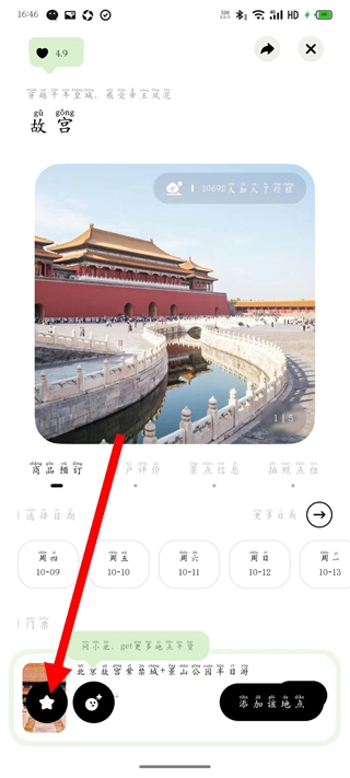 进入景点详情页面后,找到左下角的星形图标并点击,即可完成该景点的收藏操作。