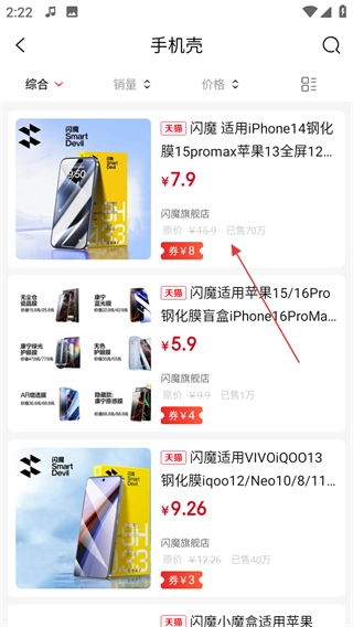在数码分类页面,点击手机壳选项,即可进入手机壳商品列表页面。