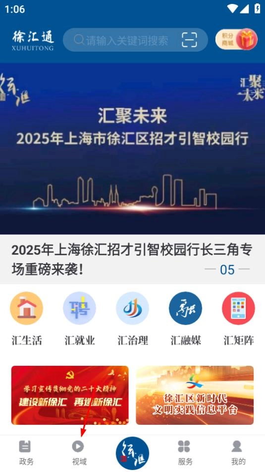 打开徐汇通,在首页点击下方底部视域按钮进入。
