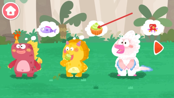 进入第一关时,首先要留意恐龙的需求,像蛋糕、鱼这类物品,然后点击对应的物品并拖动进行投喂,以此完成互动。