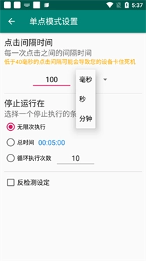 2、借助设置功能能够调节连点的间隔时长与执行次数,间隔时长越短,连点的频率就会越高。