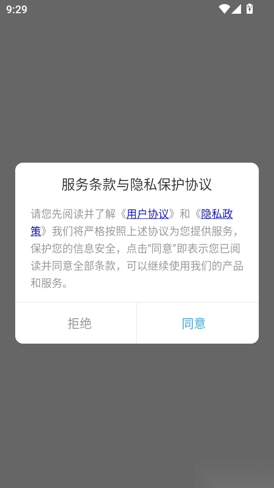 1. 第一步先打开软件,仔细阅读条款与隐私保护协议,阅读完毕后点击“同意”按钮进入下一步。