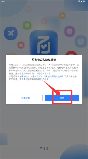 1、打开应用,在弹出的服务协议窗口中勾选同意选项以继续后续操作。