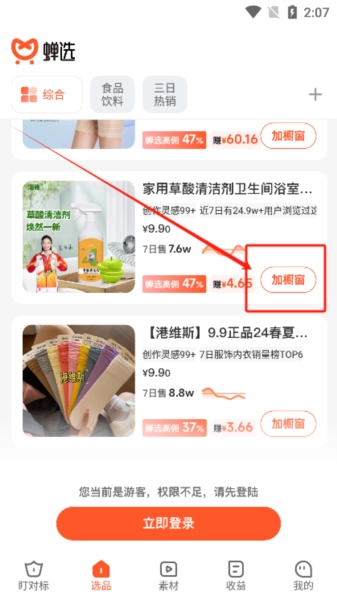 1、蝉选首页会实时推送各类商品供大家挑选,要是碰到自己喜欢的商品,能进行收藏或者添加到橱窗。