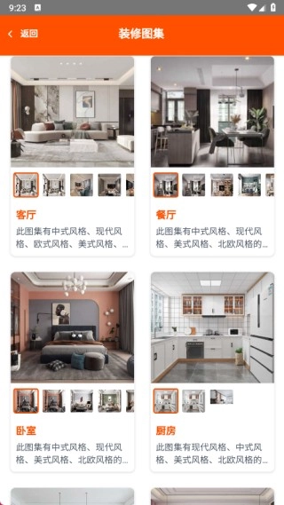 2、进入装修图集页面后,就能查看客厅、餐厅、卧室、厨房、书房、儿童房以及卫生间的相关图集。
