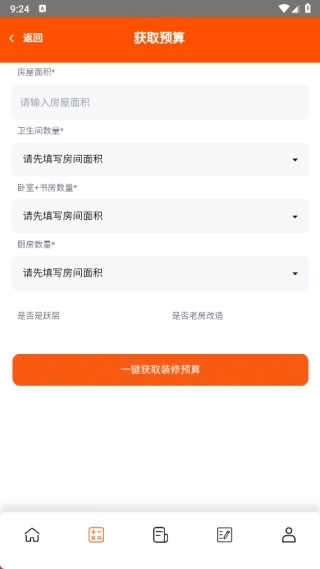 3、进入获取预算页面后,依次填写房屋面积、卫生间数量、卧室与书房的合计数量、厨房数量,随后点击“一键获取装修预算”按钮即可。