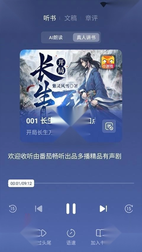 3、之后会自动跳转到听书界面。进入听书界面后,用户可以对听书相关功能进行设置,比如阅读语速、阅读声音等。