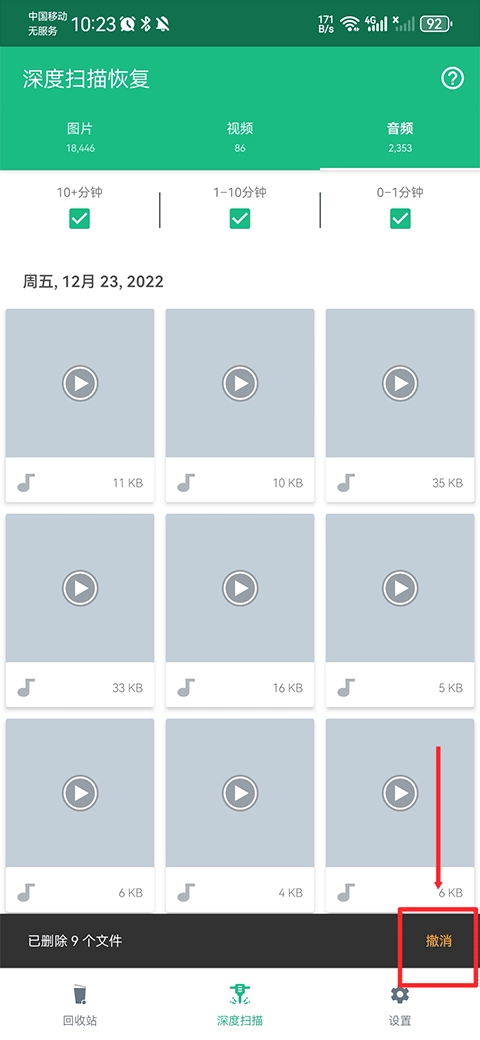 1、在中打开深度扫描界面后,系统会自动对过往删除的图片、视频与音频进行扫描