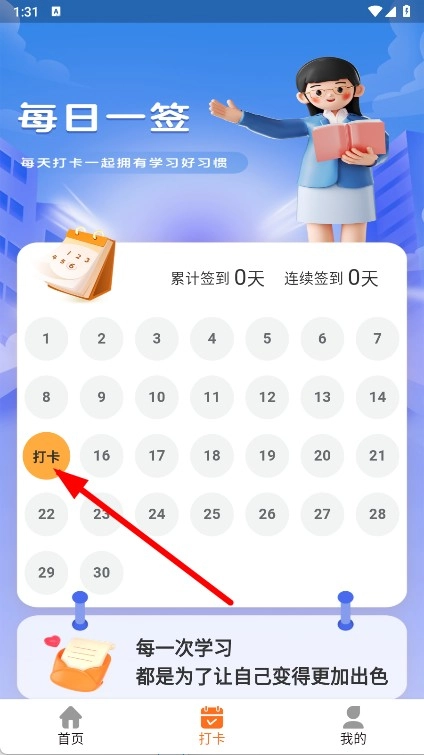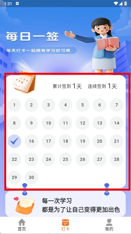 打卡成功后,会展示累计签到天数与连续签到天数等内容,让用户能直观了解学习打卡的进度。
