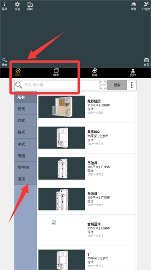 在设计页面中,您既可以通过名称搜索户型,也能浏览左侧的风格分类进行选择。