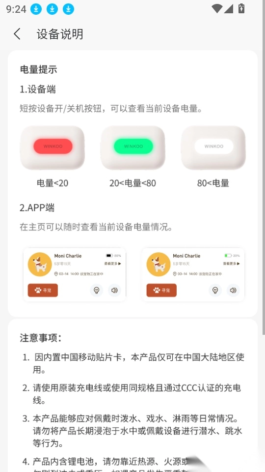 winkoo软件如何查看宠物定位器的设备说明详情内容?