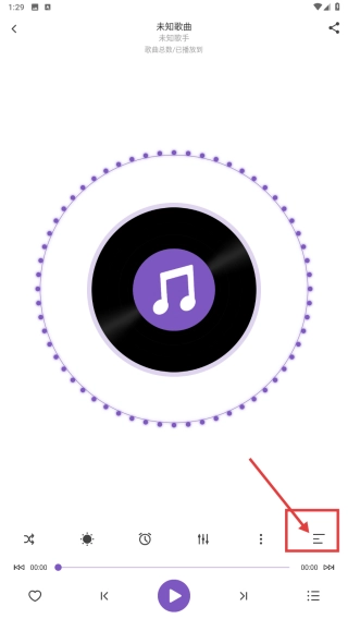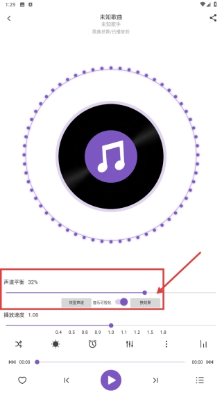 在音乐播放页面,点击右下角的菜单按钮,就能打开音效设置的相关选项。