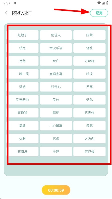 请记住需要展示的词汇,完成相关内容后点击右上角的“记完”按钮,以此完成随记词汇的训练任务。