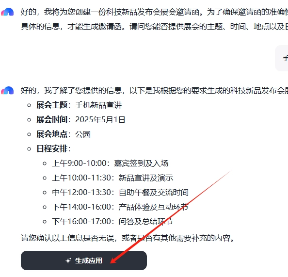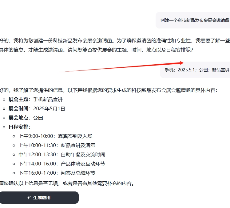 4.输入您的具体需求,例如创建一份科技新品发布会的展会邀请函。