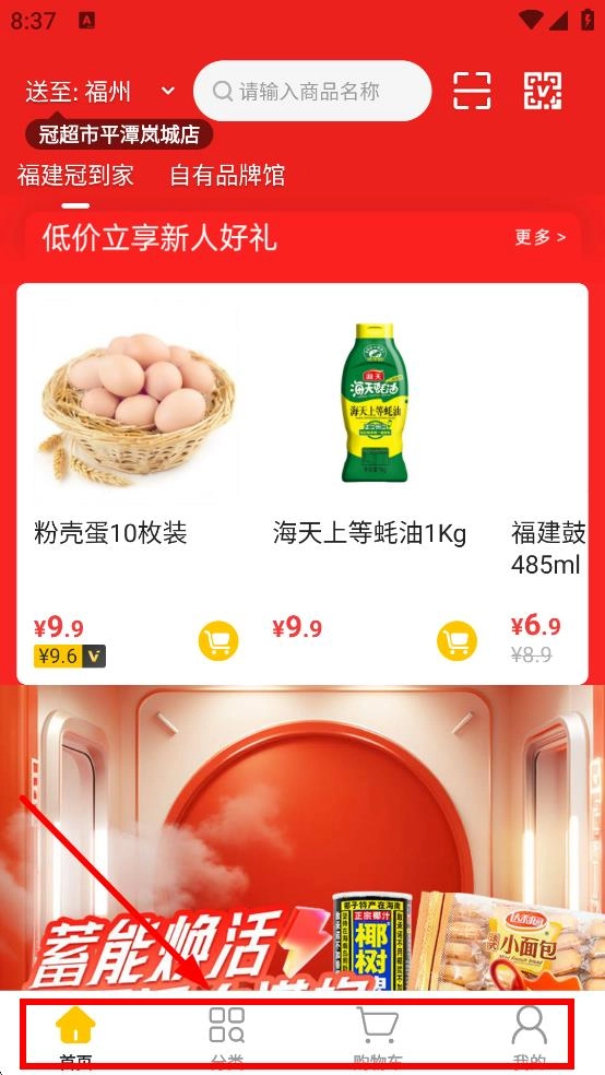 在首页能看到“低价立享新人好礼”板块,还有粉壳蛋、海天上等蚝油这类商品;页面底部设有多功能入口,便于用户操作。