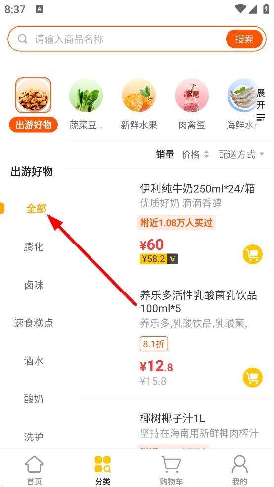 点击底部的分类选项进入分类页面后,在出游好物分类下选择“全部”,即可查看该分类下包括伊利纯牛奶、养乐多在内的所有商品。
