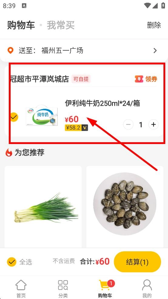 在购物车页面,你可以查看已添加的伊利纯牛奶,调整商品数量,或者点击结算按钮完成购买流程。