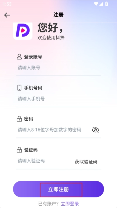 点击后会跳转到注册页面,在该页面依次填写登录账号、手机号码、密码和验证码,完成后点击【立即注册】按钮即可。