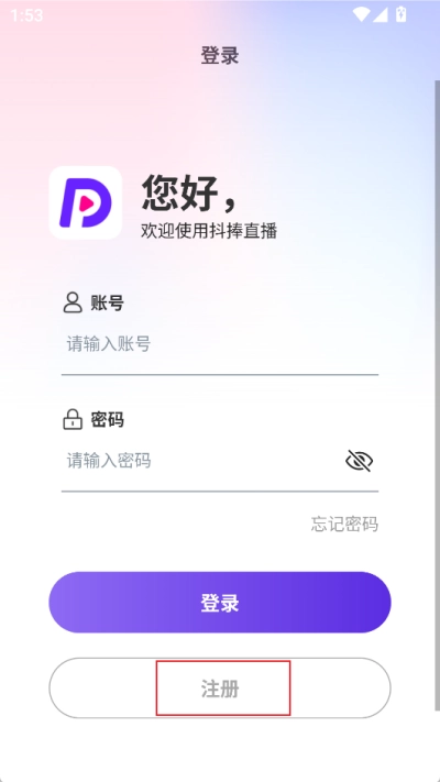 首先打开抖捧应用,进入软件后点击底部的【注册】按钮。