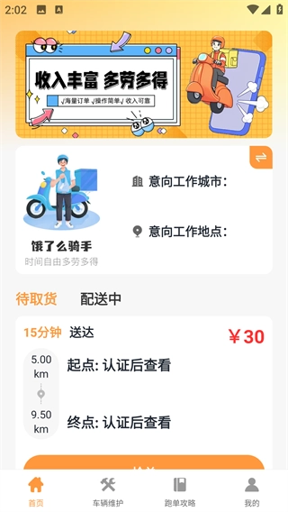 1、首页采用简洁明了的设计风格,核心功能直观呈现,可实时展示当前抢单动态,涵盖订单数量、订单位置、预计收入等关键信息;