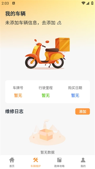 1、车辆维护功能支持骑手录入个人车辆信息,涵盖车辆型号、购买日期、保养周期等内容。
