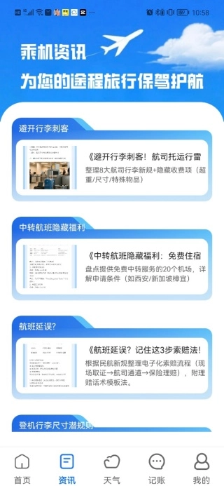 在资讯页面中可以了解关于乘机的各类资讯,帮助解决各类遇到的问题;