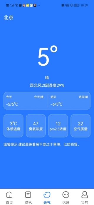 在天气页面能够查看当地最新的天气状况,以及空气质量等相关分析内容。
