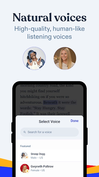 Speechify是一款独具特色的安卓文字转语音AI智能软件。在Speechify里,用户可以选择多种不同的声音模板,选好模板后,只需将文字或文献资料输入Speechify安卓版,就能快速把文字转换成语音。生成完整语音后,用户还能调节语速等参数,以获取更人性化的定制语音服务!