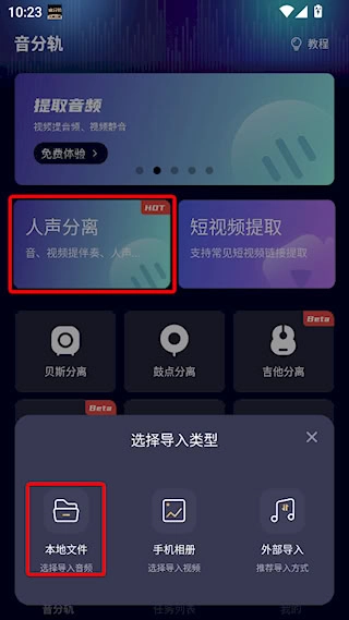 1、启动应用后,先选择人声分离功能,再从本地存储空间导入待处理的音频文件。