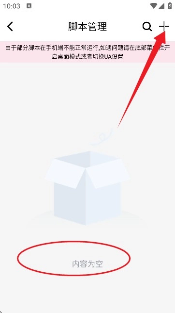 2、如图所示,进入一个空白的脚本管理界面后,点击右上角的【+】按钮。