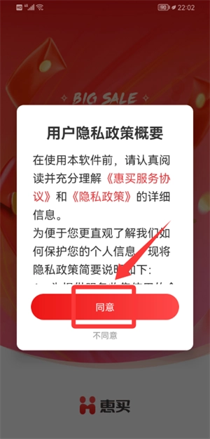 1、打开惠买商城应用,阅读隐私政策概要后点击同意按钮。