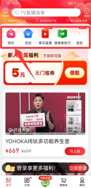 进入首页后,您可以通过各类活动入口参与活动,也能直接浏览平台推荐的商品。