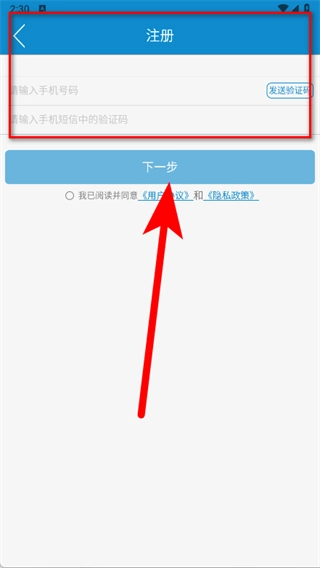 4、输入手机号码,点击发送验证码,填写收到的验证码,勾选相关选项后点击下一步。