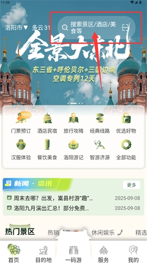 1、打开应用后,在首页的搜索框中输入景区、酒店之类的关键词来开展检索。