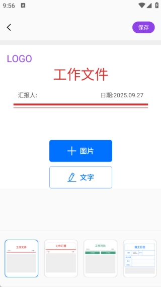 2、使用拼图汇报功能时,依次填写名称、汇报人、日期,上传图片或输入文字,再添加logo,完成后保存就可以了。