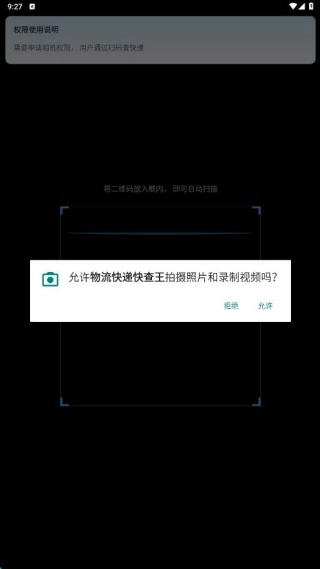 2、进入扫码查询板块,开启拍照权限后,扫描快递条即可获取物流动态。