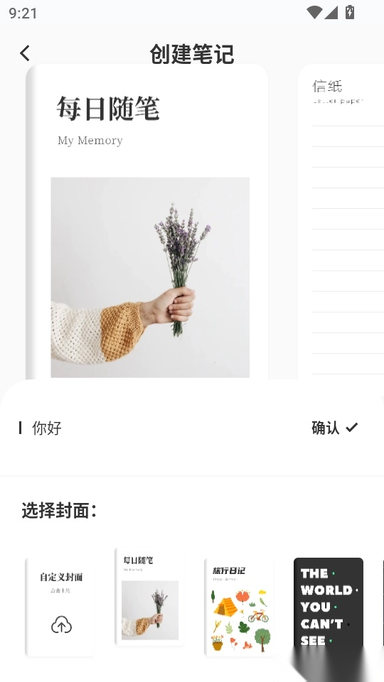 4. 接下来,大家输入笔记名称并选择好封面后,点击“确认√”按钮即可进入下一步操作。