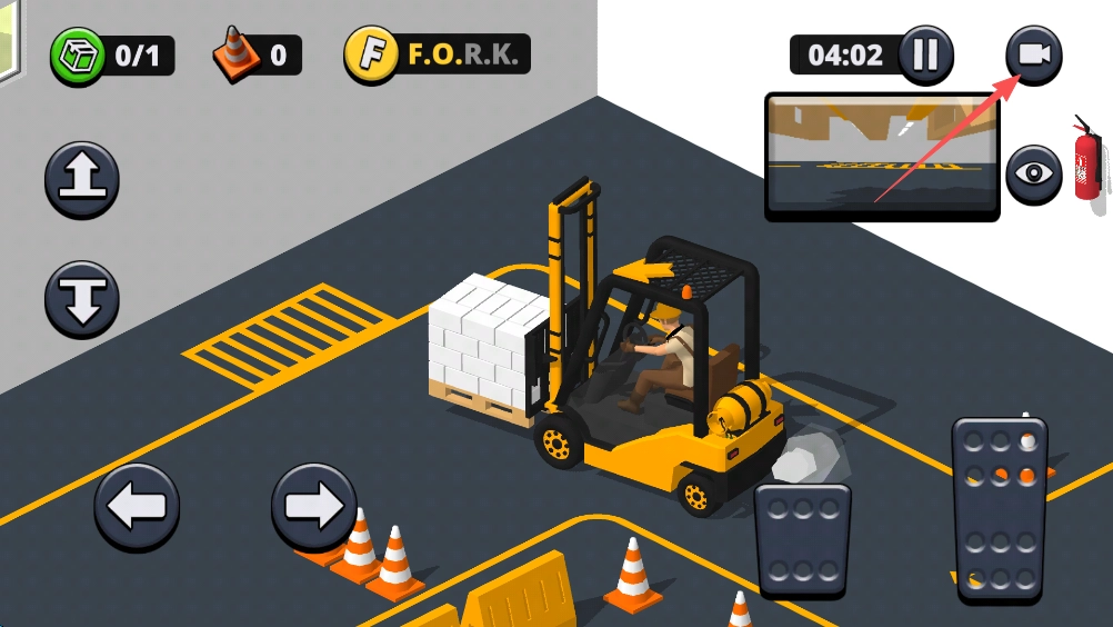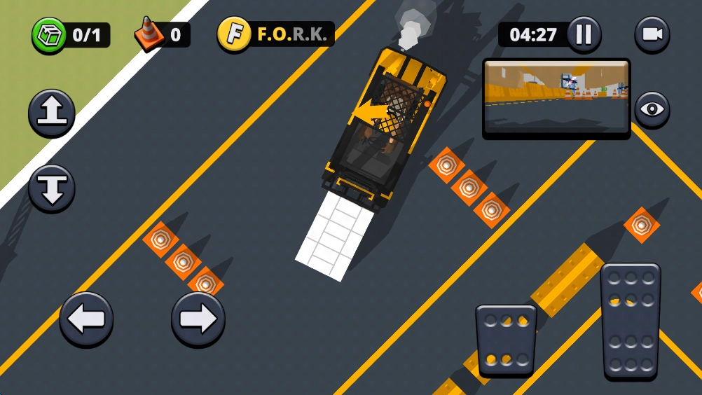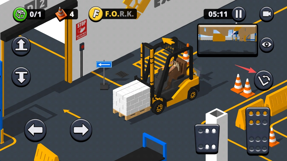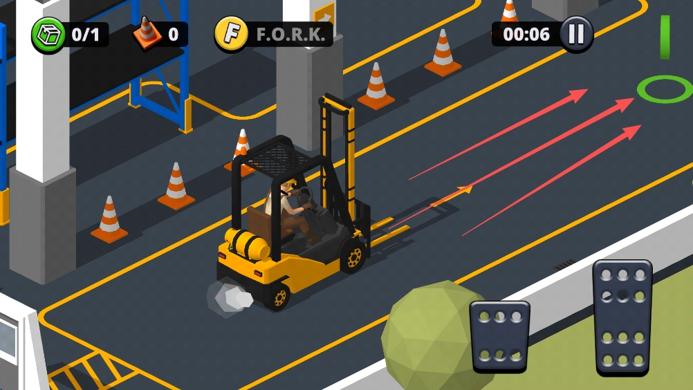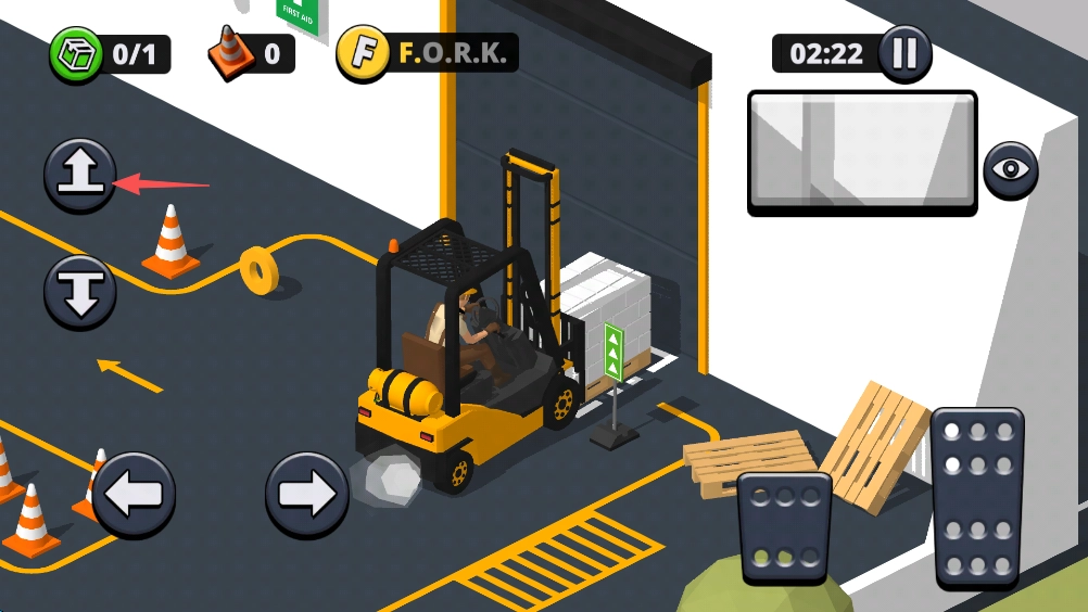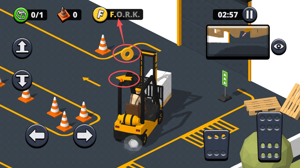 7、叉车上方设有箭头标识,它指向的是下一目标的方向;同时地图上的“O”字母也能为我们提供指引。每一关我们都有机会收集“FORK”这四个字母,若想达成三星通关,这些字母是必须收集的。