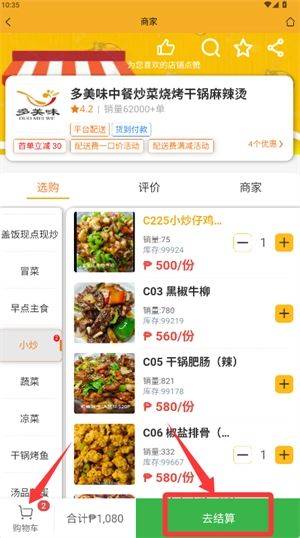 4、确定好目标商家后,添加需要的菜品并点击结算,就能生成订单了。
