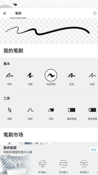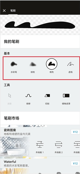 2、选好颜色后,再次点击填充功能进入笔刷界面,接着挑选你喜欢的笔刷进行填充操作——不同的笔刷,对应的填充方式也会有所区别。